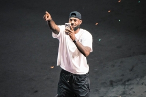 或许是惊讶于现场上万名球迷的激情澎湃,詹姆斯一出场亮相就掏出手机环拍一圈所有球迷的欢呼场景。